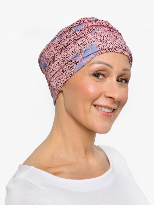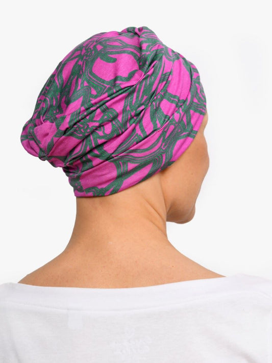 Pamper yourself with a silky soft chemo hat in beautiful bright pink with a delicate green print: a splash of sunlight that is suited for both cool and warm skin types.