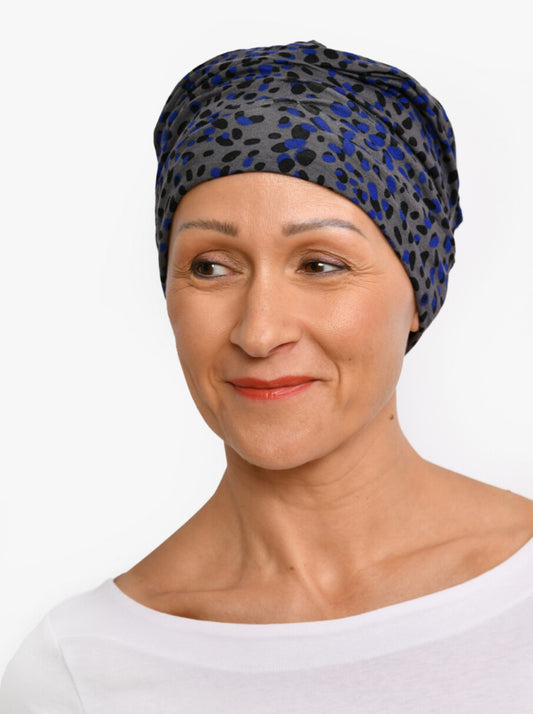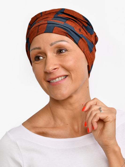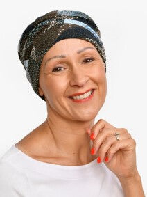 Regular price €43,95Regular priceUnit price / perSale price €43,95This chemo hat with its sophisticated Clouds print is a stylish eye-catcher that adds character to your face. The delicate khaki and brown pattern is softer than dark brown, and works well on days when you look paler because of your chemo treatments. A good cancer turban for emphasising your personality in spite of your hair loss due to chemo or alopecia.