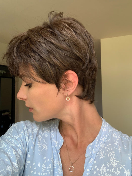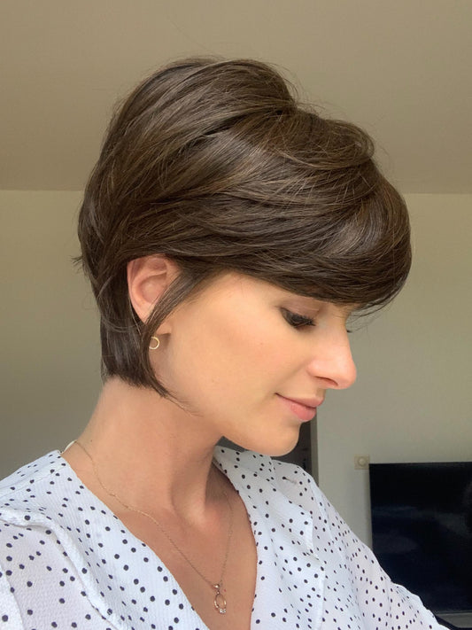 Just the right amount of low-density hair that’s amazingly light, comfortable, bold, and stylish. Close-cropped sides, a short, tapered back, and longer layers on top with perfect hand-knotting for an undetectable hair line with complete coverage and volume, but no bulk or weight because A Perfect Wig Does Not Need a Lot of Hair!