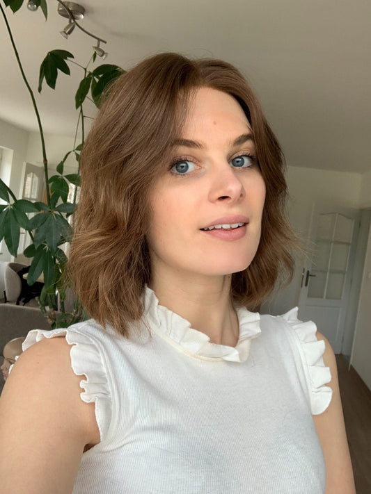 Regular price €1.845,00Regular priceUnit price / perSale price €1.845,00Meet Carly — a soft and elegant Slavic wig in a size small, made from high-quality, uncolored light brown hair. The natural tones give it an effortlessly real look, while the bouncy layered cut adds volume and movement. Carly dries straight and smooth, making it easy to style. Finished with a bleached hairline for an invisible blend